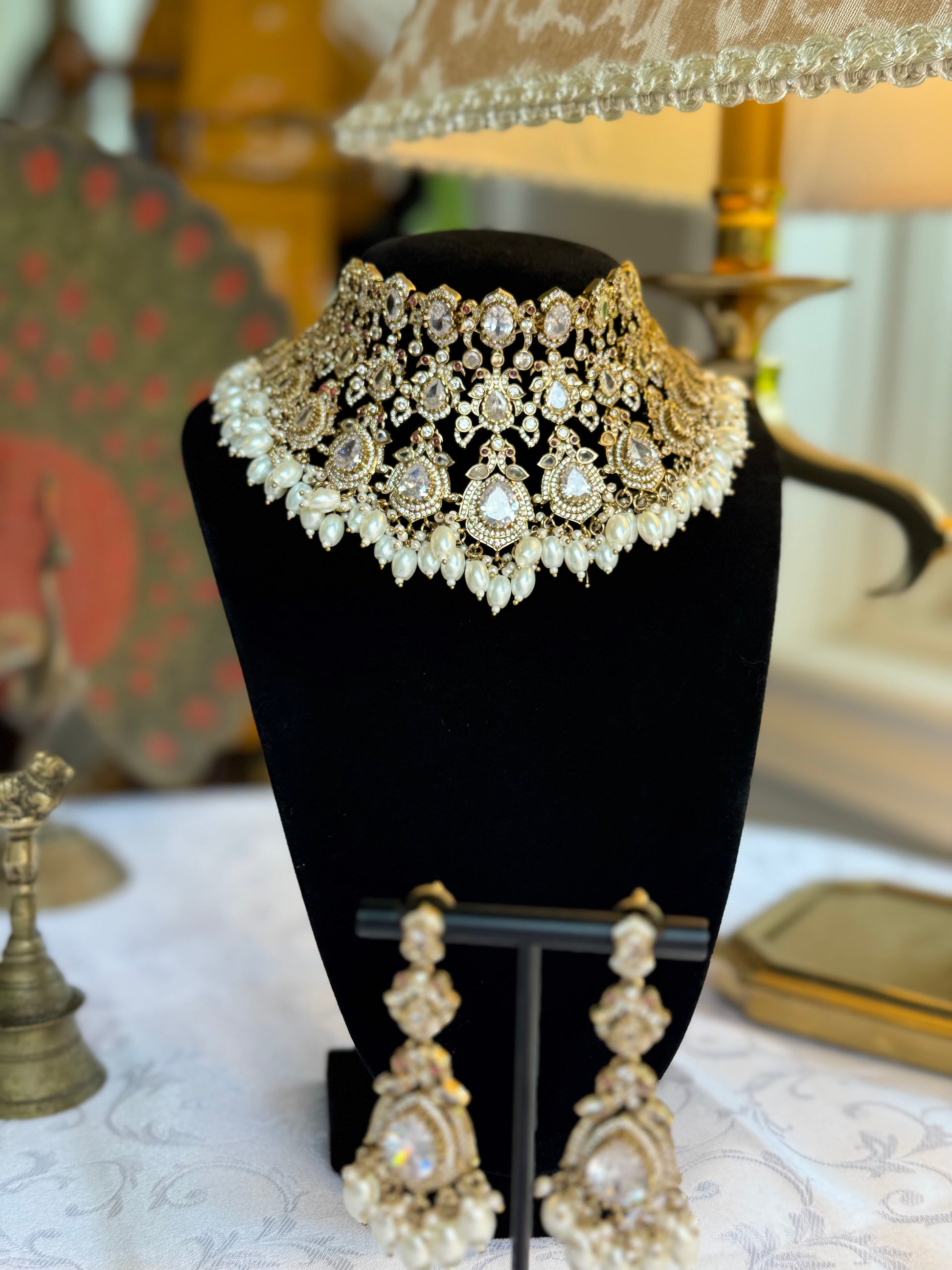 Devadasi is a bridal necklace set that marries classical beauty with modern poise. Featuring an intricately sculpted structure, layered silhouette, and regal dropwork, this piece radiates elegance with every turn of the head.